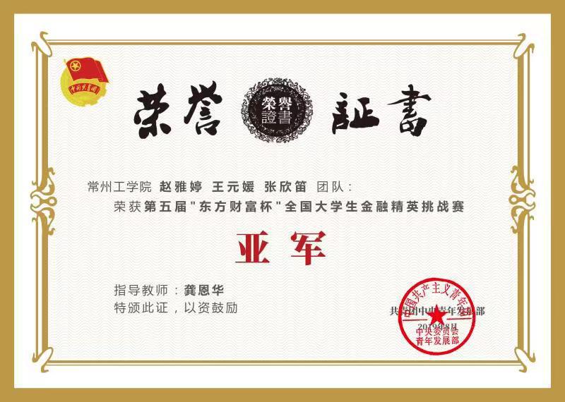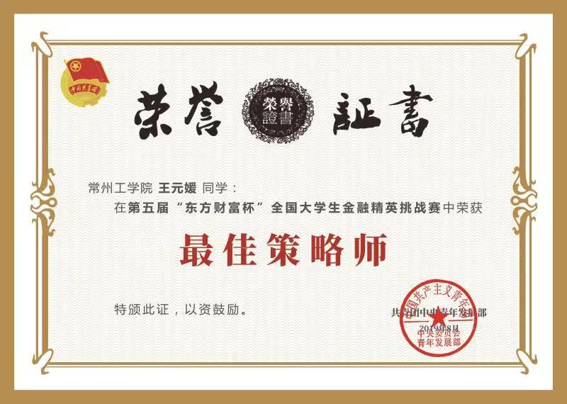 由共青团中央青年发展部主办,东方财富信息股份有限责任公司、全国共青团研究中心和共青团复旦大学委员会承办的第五届“东方财富杯”全国大学生金融精英挑战赛经过四个月的比赛,于11月28日举行颁奖大会。我校经济与管理学院指导团队经过通力合作共获得:全国亚军、最佳策略师、国赛最佳组织奖、最佳指导老师奖(全国共3名)。国赛一等奖团队共5个,我校排名全国第三、江苏省第一。