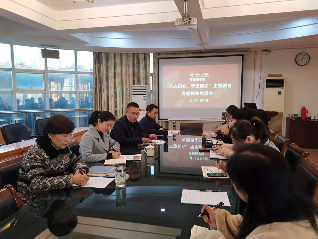 根据校党委统一部署,12月4日下午,外国语学院党委领导班子召开“不忘初心、牢记使命”主题教育专题民主生活会。校党委常委、党委宣传部部长王萍霞到会督导。院党委书记刘一鸣主持会议。全体党委委员参加会议,李静院长、马霞副院长列席会议。