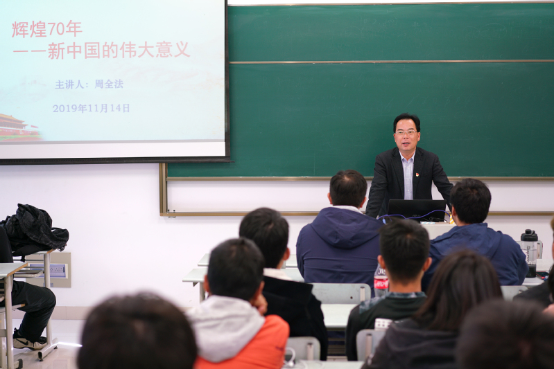 11月14日下午,校党委副书记、副校长周全法走进化工与材料学院19应化班,以《辉煌70年――新中国的伟大意义》为题,给学生上了一堂别开生面的思想政治教育课。