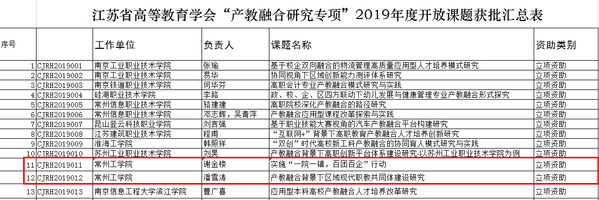 2019年度江苏省高等教育学会“产教融合研究专项”课题共立项资助34项,立项不资助40项。我校谢金楼教授主持的《实施“一院一镇,百团百企”行动》和潘雪涛教授主持的《产教融合背景下区域现代职教共同体建设研究》成功获批立项资助;李晓芳教授主持的《产教融合背景下物联网专业“四融合”育人模式研究》和陈功副教授主持的《产教融合和校企跨界学生创新实践与分析》获得立项。