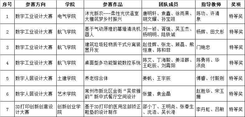 近日,由国家科学技术部、工业和信息化部、教育部、中国科协等部门指导,国家制造业信息化培训中心、国家两化融合创新推进联盟、3D动力千企百校产教联盟、中国图学学会等单位共同主办的2019年全国三维数字化创新设计大赛江苏赛区比赛落下帷幕。我校航航空与机械工程学院/飞行学院、汽车工程学院、电气信息工程学院、光电工程学院、土木建筑工程学院、艺术与设计学院、创新创业学院报送的参赛作品荣获特等奖7项,一等奖16项,二等奖21项,三等奖4项,是我校参加该项竞赛以来取得的最好成绩。7项特等奖作品入围全国总决赛。