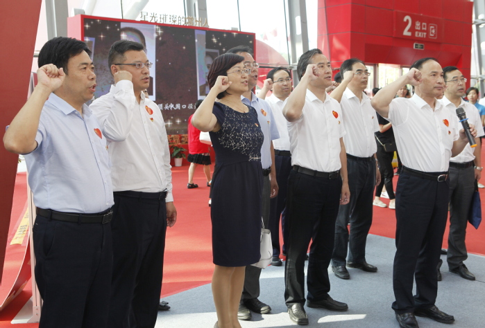 在讲解员的带领下,校领导们依次浏览了序厅、砥砺前行辉煌成就展;三个明星城市、道德讲堂、幸福家园美好生活展;伟大工程党建新气象等七个特色展厅和地区展。领导们不时驻足观看、听取讲解、交流探讨。在党旗前,全体校领导庄严的重温了入党誓词。