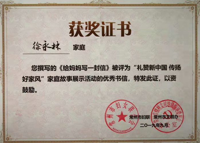 在喜迎新中国70华诞之际,由常州市妇联和常州市文明办联合举办的“礼赞新中国传扬好家风”家庭故事展示活动评选结果揭晓。我校退休教授徐永林(家庭)创作的《给妈妈写一封信》(《献给我的母亲——中国》)获优秀书信奖,并现场接受表彰。