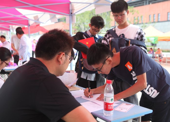 据了解,为了确保所有家庭经济困难学生都能顺利入学,暑假,学校利用“互联网+”手段将“绿色通道”向前延伸,新生拿到录取通知书即可在系统中完成提交材料,申请困难认定和学校复核。今年学校派出80余名资助政策志愿宣传大使,利用假期返乡,深入到社区、街道和学校,宣讲国家资助政策。今天报到现场,共有100位家庭经济困难的新生收到学校精心准备的“爱心大礼包”。