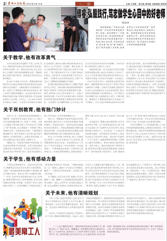 他深藏若虚,“不要关注成绩”是采访中他重复最多的一句话;他分甘绝少,“只想分享自己的一些经验和做法”同样是采访中他重复最多的一句话;他以名正身,不惟传道受业,更注重“渔”和“睿”的赋予。基于“既然选择了当老师,就要当学生心目中的好老师”的价值追求,他弘毅践行,坚持用心做、坚持持续做大学生创新创业教育工作,曾作为创新创业优秀指导教师在不同场合进行经验交流。他,是我校土木建筑工程学院副教授傅睿。