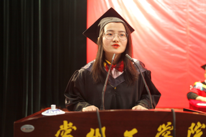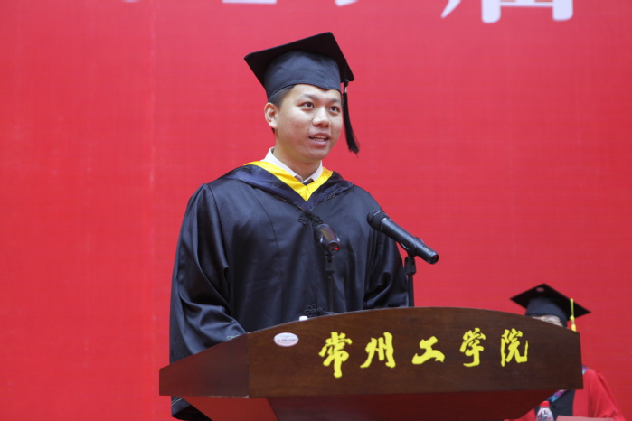 挥手自兹去,漫诉常工印。毕业生代表——电气信息工程学院丁浩、人文学院钱佳满含深情,倾诉了四年来与常工同成长、共进步的点点滴滴。他们表示,“教会学成、守正有为”的校训是自己一生的精神烙印和人生注解。无论走到哪里,都不会忘记奋斗、勇于尝试、感恩的“常工烙印”。