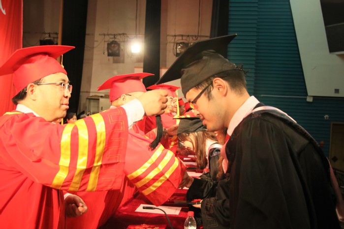 雄壮的《国歌》声后,和着欢快的背景音乐,毕业生代表先后上台接受毕业证书和学士学位证书。