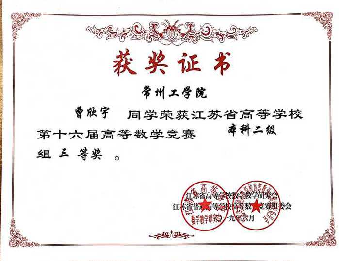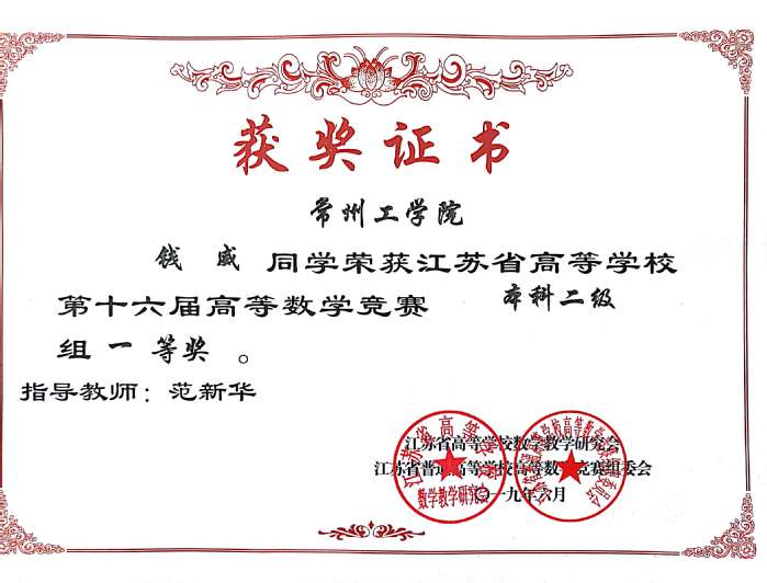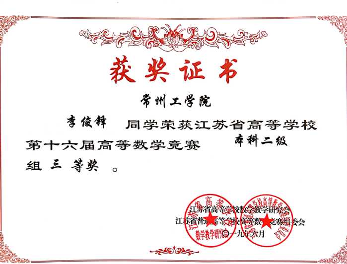 近日,江苏省普通高等学校第十六届高等数学竞赛结果揭晓,我校参加本科二级竞赛的150名同学中,钱威等19人荣获一等奖,董贞贞等28人荣获二等奖,李俊锋等39人荣获三等奖。