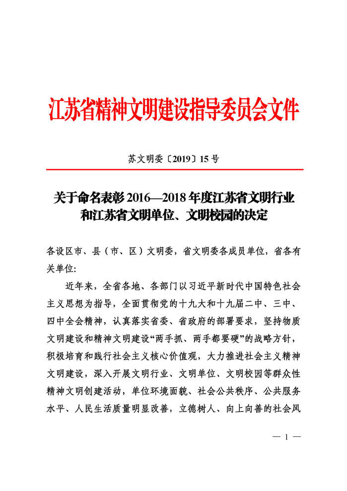 12月7日,江苏省精神文明建设指导委员会印发《关于命名表彰2016—2018年度江苏省文明行业和江苏省文明单位、文明校园的决定》(苏文明委〔2019〕15号),我校被命名表彰为“2016-2018年度江苏省文明校园”,这是继我校获评“2013-2015年度江苏省文明校园”之后再次荣获该称号。