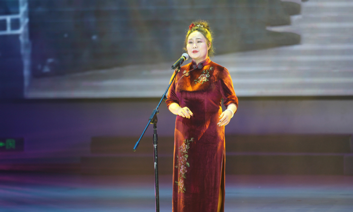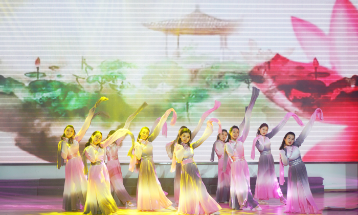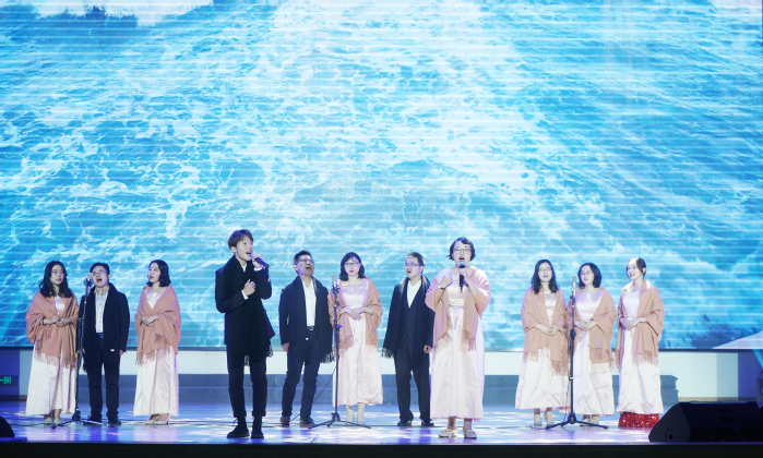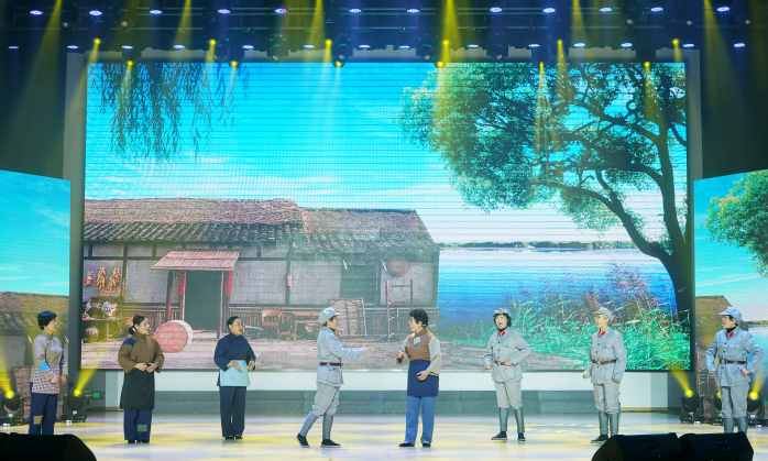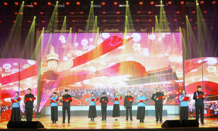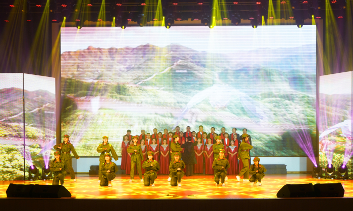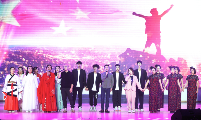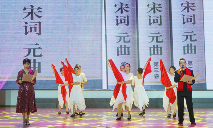 第二篇章中,歌舞秀《追梦艺设人》歌舞相伴、优雅与动感并存、传统与现代相生,生动展现了艺术与设计学院师生不懈追梦的风骨。土木建筑工程学院、经济与管理学院的合唱《国家》《我们走在大路上》,以及图书馆的朗诵《大写的中国》、国际交流学院的朗诵+舞蹈《读中国》、人文学院的配乐诗朗诵《中华颂》,精彩纷呈地表达了一个共同的主题——70年来,从站起来、富起来到强起来的中国,值得每一个中华儿女维之护之、爱之颂之。强大的文化自信、道路自信充溢于歌间舞际。离退休党工委、关工委献上的京剧表演唱沙家浜《军民鱼水情》真实反映了沙家浜军民鱼水情深的感人图景及同心抗日的革命史实。