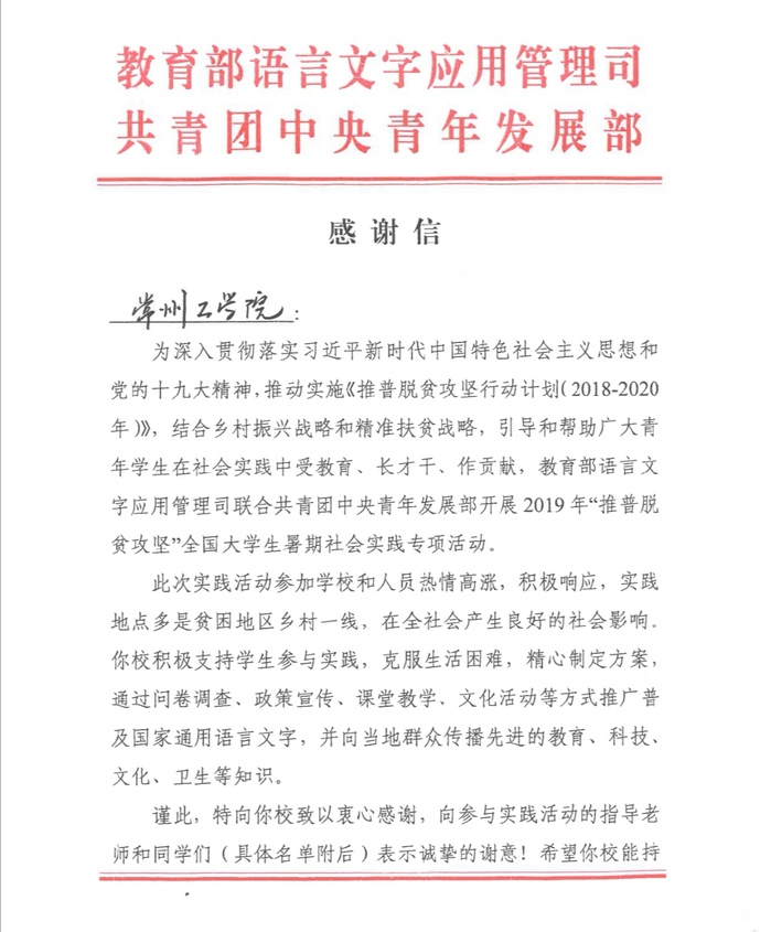 近日,我校人文学院收到来自教育部语言文字应用管理司和共青团中央青年发展部共同发来的感谢信,对我校“推普脱贫•同舟共济”实践团队在2019年暑期开展“推普脱贫攻坚”全国大学生暑期社会实践专项活动中的表现给予了充分肯定。