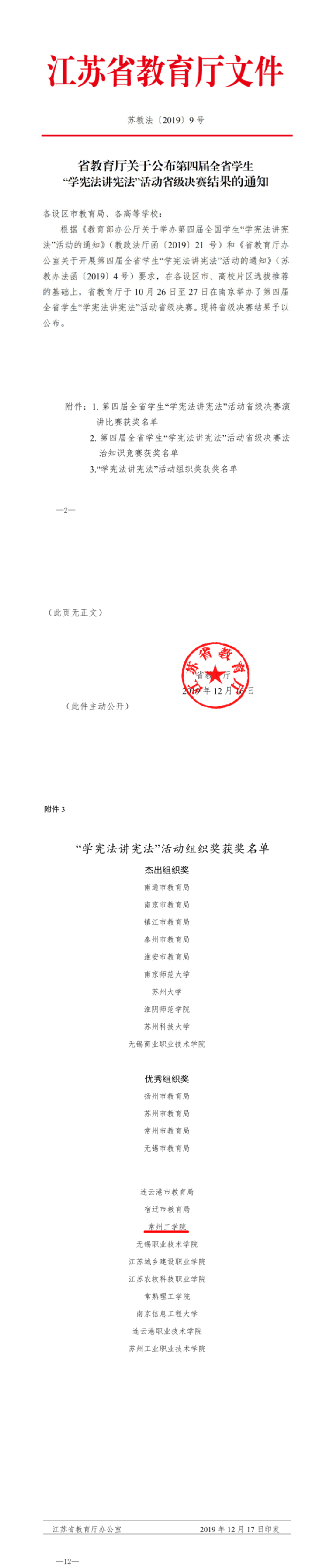 12月17日,江苏省教育厅公布了第四届全省学生“学宪法讲宪法”活动省级决赛结果,我校荣获“优秀组织奖”称号。