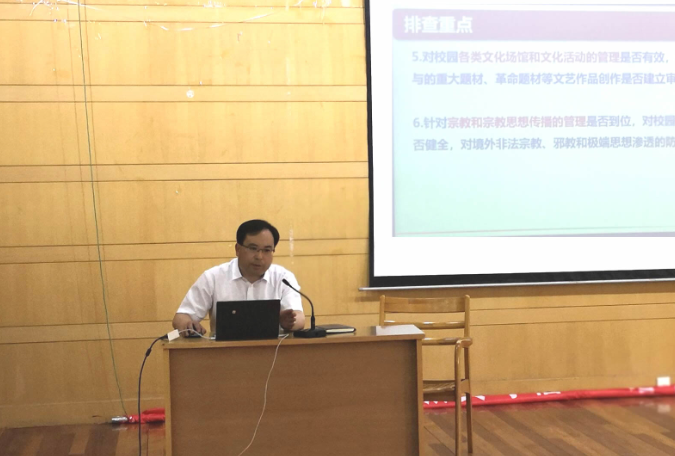 5月29日,师范学院举办意识形态工作专题党课,副校长王传金为全体教职工上课,解读了意识形态工作的相关文件制度,讲解了我校落实意识形态工作责任制的具体要求。他指出,我们要切实增强政治意识、大局意识、核心意识、看齐意识,牢牢把握意识形态工作的领导权、管理权、话语权,压紧压实意识形态工作责任,加强意识形态阵地管理,不断提高意识形态工作能力,为学校改革发展营造良好氛围。