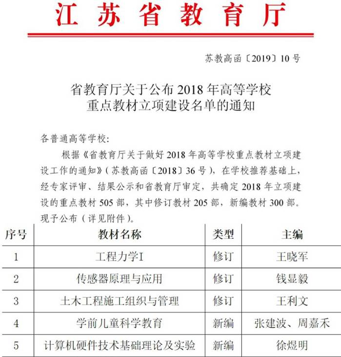 近日, 省教育厅下发《关于公布2018年高等学校重点教材立项建设名单的通知》。我校《工程力学Ⅰ》《传感器原理与应用》《土木工程施工组织与管理》《学前儿童科学教育》《计算机硬件技术基础理论及实验》5部教材榜上有名。
