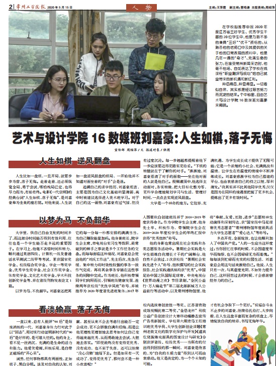 学校拟推荐申报2020年度江苏省三好学生、优秀学生干部的20位学生中,他是为数不多的兼具“三好”“优干”资格的;从熟悉他的老师口中及其提供的关于他的日常表现的资料中,他是几年一遇的“奇才”、充满生命的张力;在接受常州新闻采访时,他毫不怯场、自如表达了学校在线课程“职业测评与规划”给自己就业带来的新机遇和新红利。
