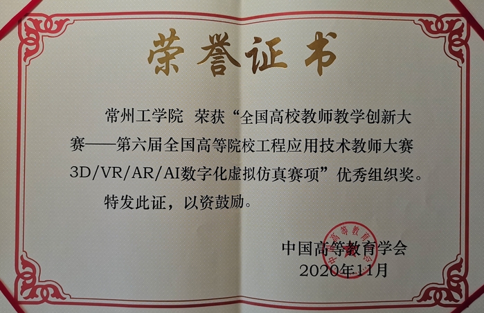2020年5月至6月间,我校向中国高等教育学会积极申报并获批成为全国高校教师教学创新大赛——3D/VR/AR/AI数字化虚拟仿真赛项江苏赛区组委会筹备组牵头单位。短短一月之内,我校完成大赛工作领导小组和工作小组、江苏赛区组委会、专家委员会的筹备工作并召开工作启动会,于2020年9月底圆满完成“全国高校教师教学创新大赛——第六届全国高等院校工程应用技术教师大赛3D/VR/AR/AI数字化虚拟仿真主题赛项”江苏赛区各项组织和评审工作,为全国总决赛推选了29个优秀参赛项目。