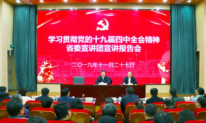 根据省委统一部署和安排,11月27日下午,我校在辽河路校区行政管理中心报告厅举行学习贯彻党的十九届四中全会精神省委宣讲团宣讲报告会。由省委宣讲团成员,市委宣讲团团长,市委常委、宣传部部长陈涛作宣讲报告。我校领导班子全体成员、全体中层干部、马克思主义学院全体教师近160人聆听报告。报告会由校党委书记曹雨平主持。 陈涛围绕“坚持和完善中国特色社会主义制度、推进国家治理体系和治理能力现代化”主题,紧扣习近平总书记在十九届四中全会上的重要讲话和全会通过的《决定》,从关于全会的基本情况和重要成果,关于全会的重大意义,关于坚定中国特色社会主义制度自信,关于全会《决定》提出的总体要求、总体目标和重点任务,关于贯彻落实好全会精神等五个方面,以大量的资料、鲜活的案例、翔实的数据,对全会精神进行了系统深入的阐释和全面准确的解读。 曹雨平在总结时指出,陈涛部长的报告科学精辟、内涵丰富、阐述清晰、条理分明,既有很强的理论针对性,又有很强的说服力,为我校深入学习领会全会精神、全面贯彻全会目标任务具有十分重要的指导意义。他强调,学习宣传贯彻四中全会精神是学校当前和今后一个时期的重大政治任务,我们要把学习宣传贯彻四中全会精神与深入学习习近平新时代中国特色社会主义思想结合起来,与贯彻落实习近平总书记对江苏工作的指示要求结合起来,与开展“不忘初心、牢记使命”主题教育结合起来,按照中央和省委市委要求,采取扎实有效措施,把学习宣传贯彻全会精神不断引向深入,不断加强学校治理体系和治理能力建设,从制度建设的高度谋划工作,保障学校各项事业高质量发展。 认真聆听报告后,与会人员纷纷表示,整场报告重点突出、论述透彻,对全面掌握、深刻领会全会精神的丰富内涵具有十分重要的作用。诸多一线思政课教师更表示,要深入学习习总书记的重要讲话精神和全会《决定》,做到学深悟透弄懂,充分发挥思想政治理论课主渠道作用,推进习总书记重要讲话精神和全会《决定》进课堂进大学生头脑,引导教育青年大学生牢固树立“四个意识”、坚定“四个自信”、坚决做到“两个维护”。 (党委宣传部 孙悦娟/摄 周绍萍/文 曹鸣谦/审核)
