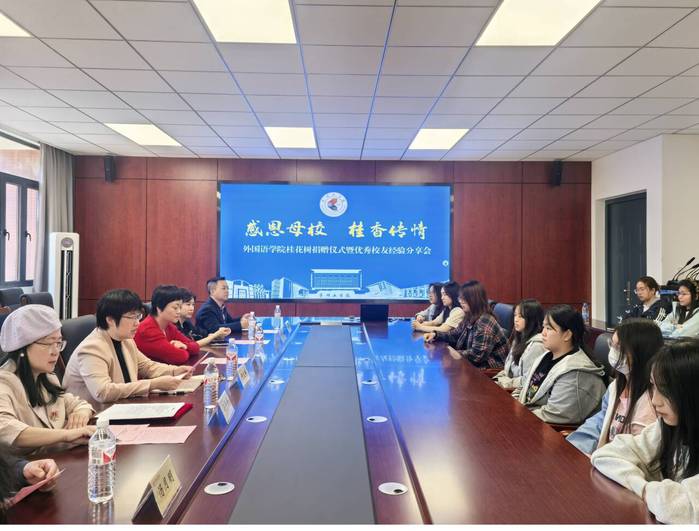 分享结束后,大家移步至校友捐赠的桂花树前合影留念,定格下这一充满温情与意义的时刻。此次活动不仅为外国语学院师生搭建了一个与优秀校友交流互动的宝贵平台,让同学们从校友的成功经验中汲取智慧和力量,更通过捐赠仪式强化了校友与母校之间的情感纽带,彰显学院团结奋进、薪火相传的优良传统。