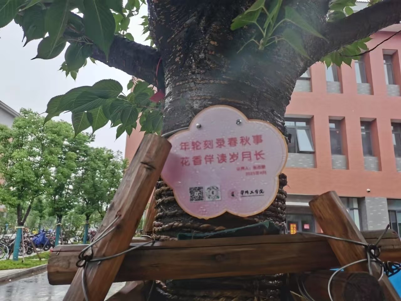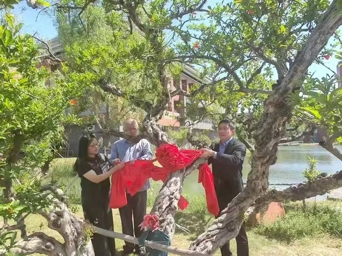 站在捐赠的百岁石榴树前,张兵颁发捐赠证书。金小虎、杨静玉、谢金楼共同为古树揭铭牌,树牌上铭刻着“富贵必从勤苦得,男儿须读五车书”的校友寄语,以此激励常工后学立志立信、奋发有为。